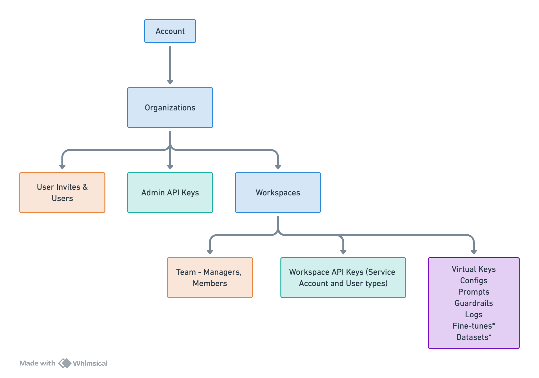 Organizations contain User Invites & Users, Admin API Keys, and Workspaces. Workspaces, in turn, have their own Team structure (with Managers and Members), Workspace API Keys, and various features like Integrations, Model Catalog, Configs, Prompts, and more. This structure enables you to: